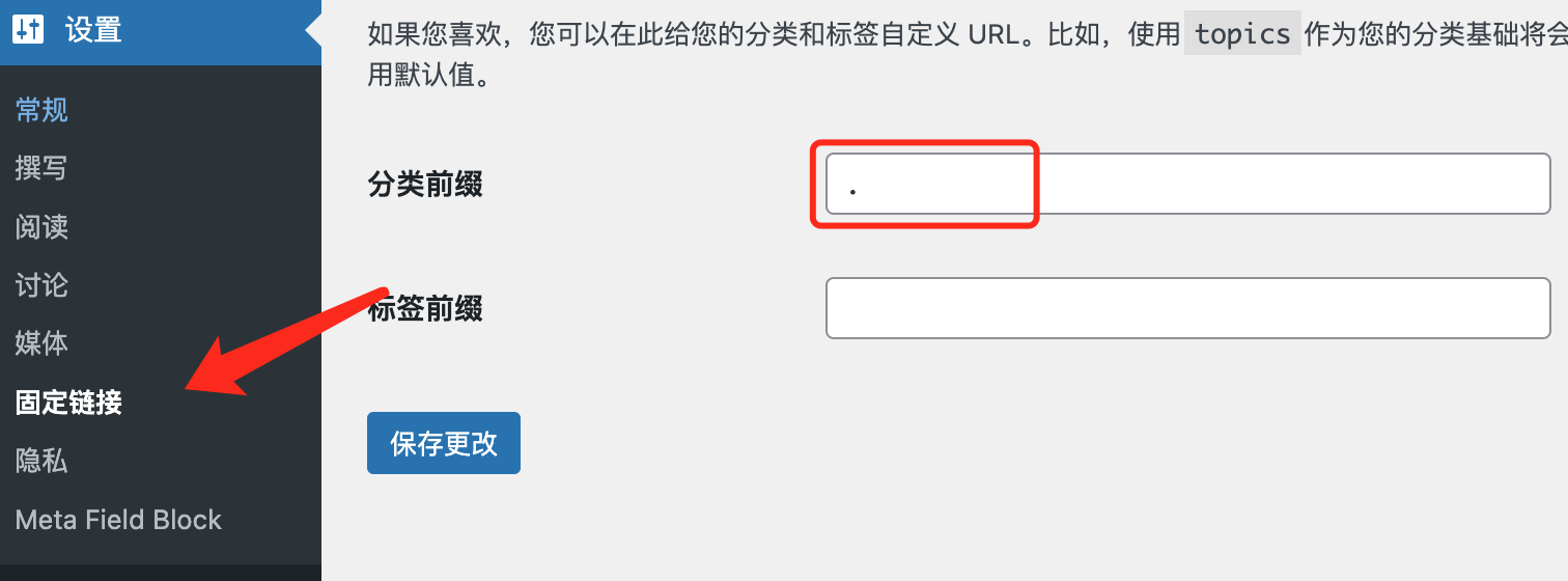 进入Wordrpress后台,设置->固定链接,将“分类目录前缀”项设置为“.”,这种方法也可以去除 category,虽然设置简单,但是效果不理想,容易出现错误。